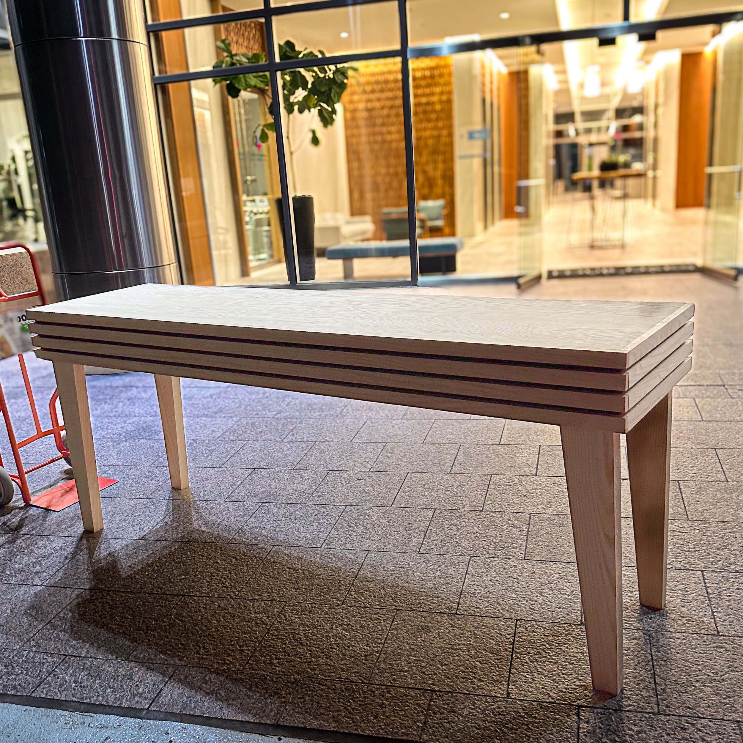 The solution was crafted from red oak, with a matte black interior layer that provides a deep visual pop, emphasizing the wood's natural texture and grain on the facade of the table edges. The biggest challenge was in the build of the legs and structure; our intent was to completely conceal the support structure behind the facade of the tabletop. The legs themselves were meticulously tapered to minimize bulkiness, creating a sense of weightlessness while still possessing the strength to support the dense, narrow display. This focus on hidden engineering and elegant form is what elevates the table from a functional surface to a true exhibition piece.