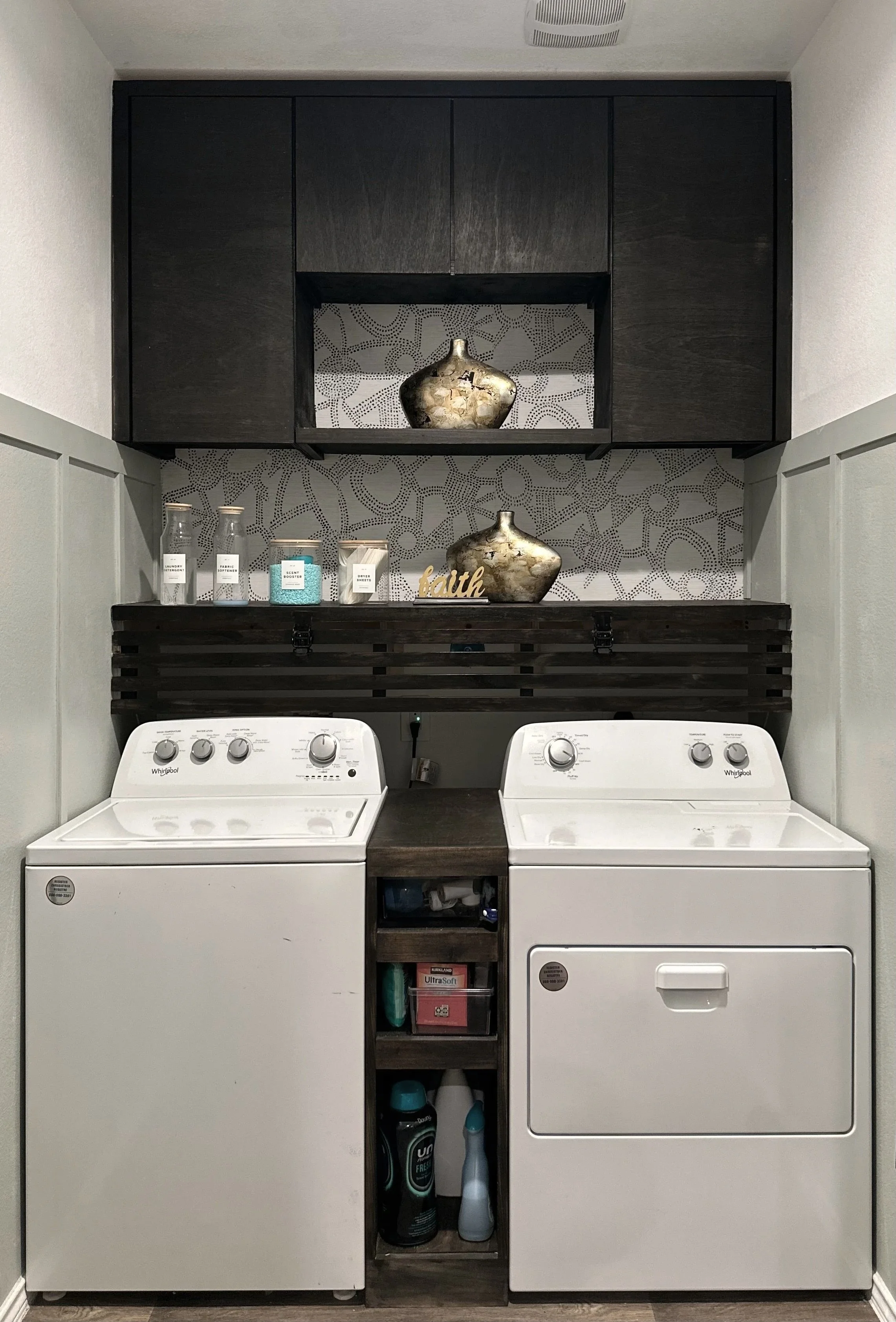 The material palette is a study in contrast and mood, anchored by a custom floating shelf that waterfalls into a privacy screen of horizontal wood slats. This bespoke feature was engineered with a dual purpose: to provide aesthetic warmth and to surgically conceal the utility connections. By cloaking the washing machine supply lines and electrical outlets behind this slat system, we achieved a seamless visual plane, ensuring that the mechanics of the room never distract from the design. The result is a clean, architectural finish that eliminates visual clutter while maintaining full serviceability.